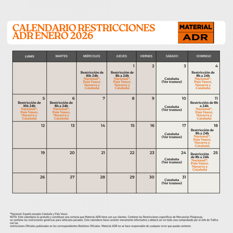Ya está disponible el calendario oficial de restricciones a la circulaciĂłn de vehĂculos ADR correspondientes al mes de enero de 2026. En este documento encontrarás las fechas y horarios en los que se aplican restricciones al transporte de mercancĂas peligrosas por carretera, segĂşn la normativa vigente.