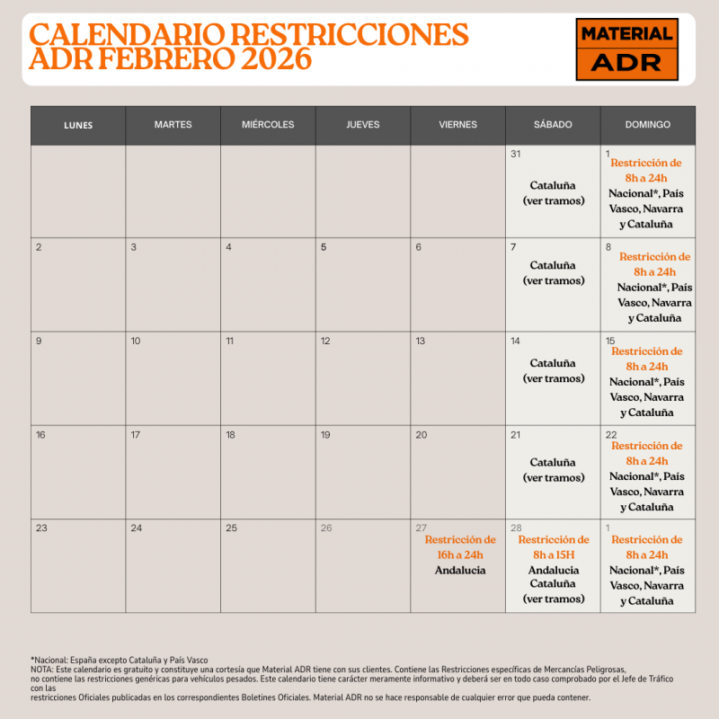 Ya está disponible el calendario oficial de restricciones a la circulaciĂłn de vehĂculos ADR correspondientes al mes de febrero de 2026. En este documento encontrarás las fechas y horarios en los que se aplican restricciones al transporte de mercancĂas peligrosas por carretera, segĂşn la normativa vigente.