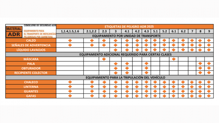 Para escoger adecuadamente la equipación, se tiene que tener en cuenta la clase del ADR a la que pertenece la mercancía transportada. A continuación, podrá consultar la tabla de la legislatura ADR.